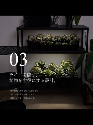 鉢の高さや植物のボリュームに合わせて、棚の高さを細かく変更できるため、背の高い植物から小鉢までバランスよくディスプレイできます。