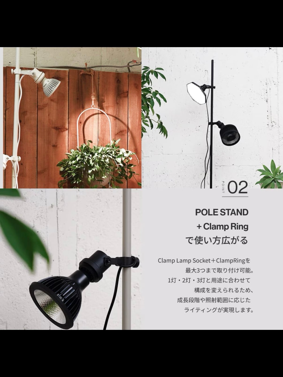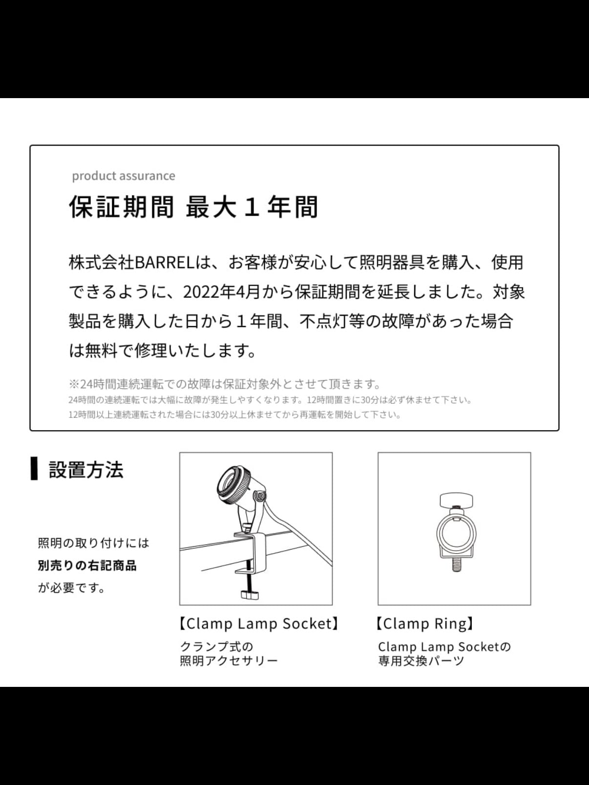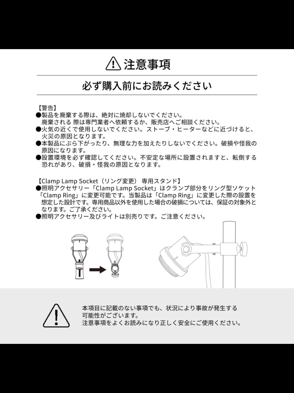 ・照明アクセサリー「Clamp Lamp Socket」はクランプ部分をリング型ソケット「Clamp Ring」に変更可能です。当製品は「Clamp Ring」に変更した際の設置を想定した設計です。専用商品以外を使用した場合の破損については、保証の対象外となります。ご了承ください。