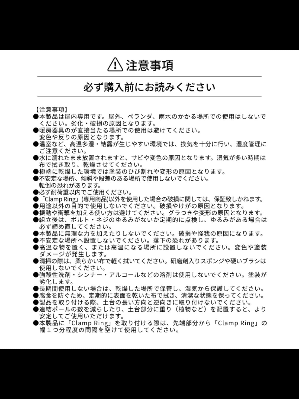 ・本製品は屋内専用です。屋外、ベランダ、雨水のかかる場所での使用はしないでください。劣化・破損の原因となります。