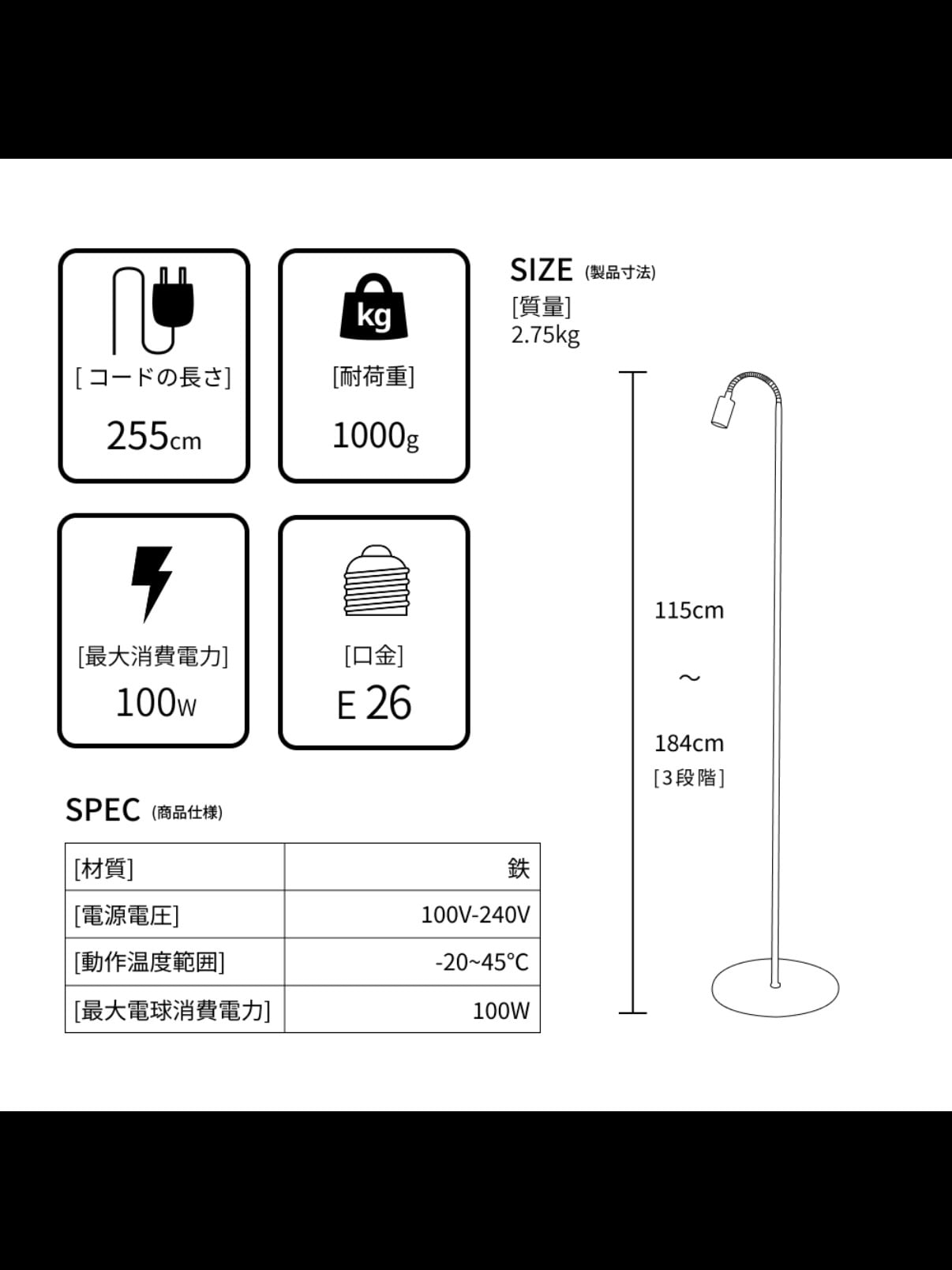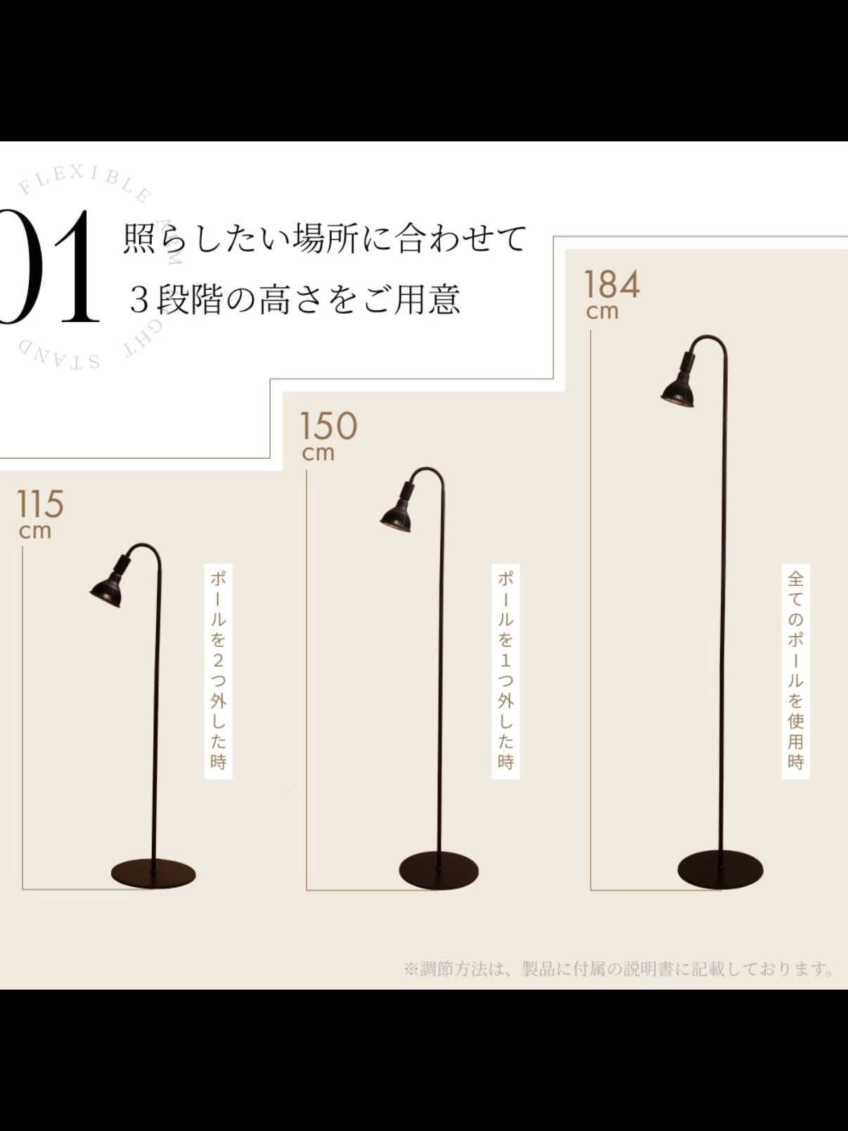 高さ調節:184cm、150cm、115cm(アームを曲げた時)